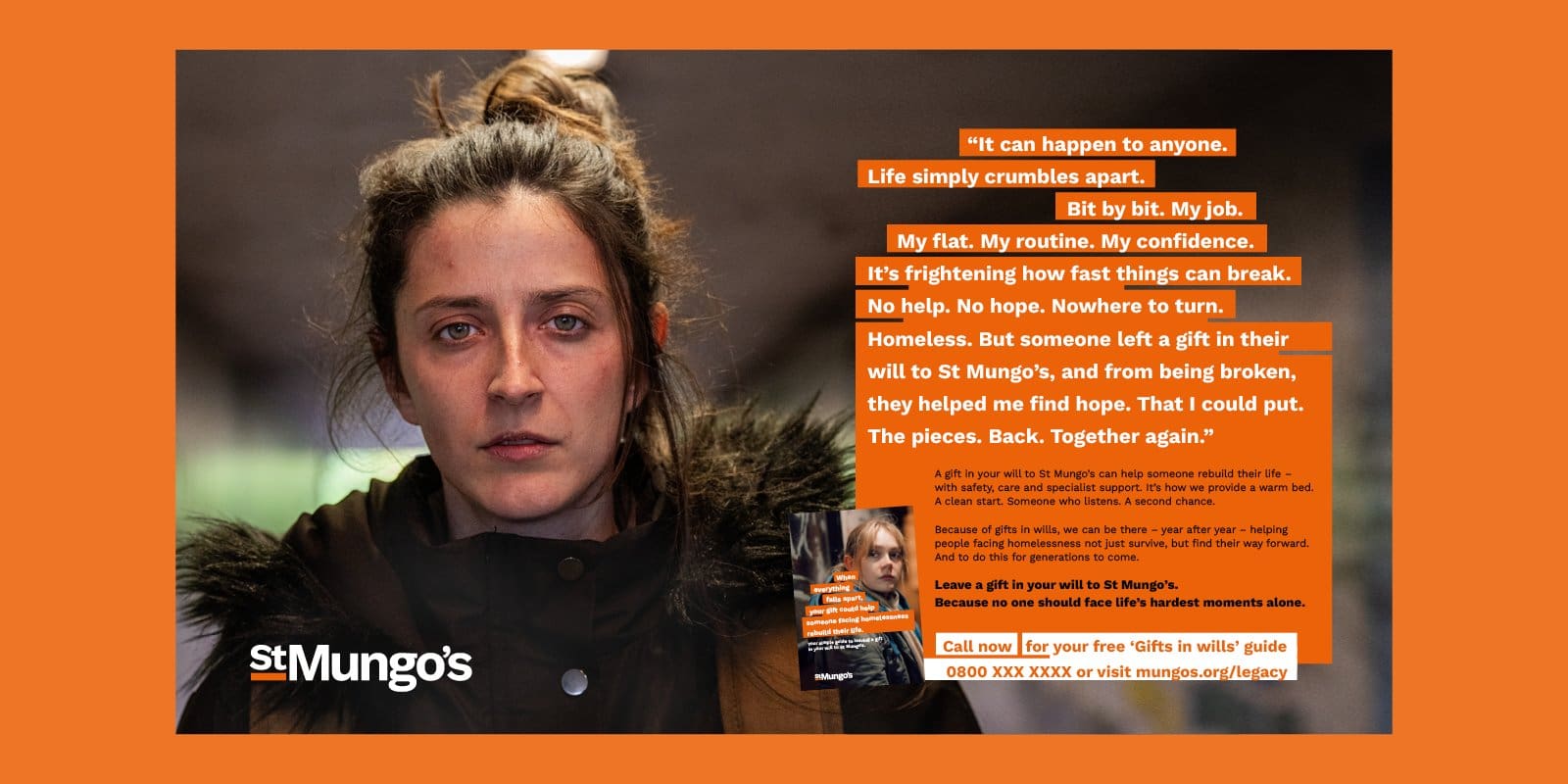 One designed to make that impact tangible. As life falls apart, the copy blocks fracture and drift… reflecting instability and loss of control. When St Mungo’s steps in, made possible by a gift in a Will, those blocks begin to return. Order replaces collapse.